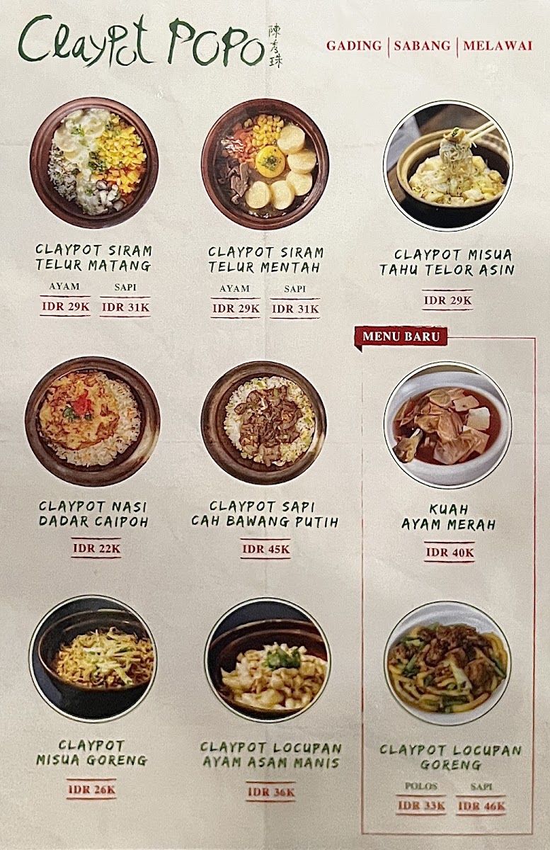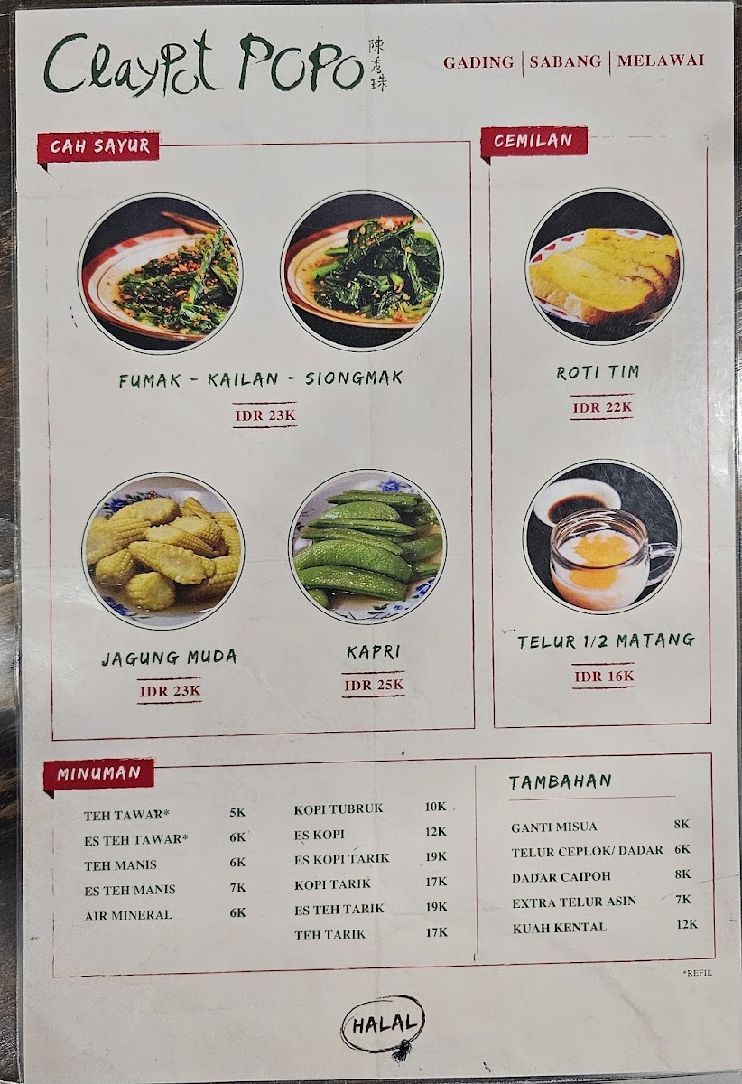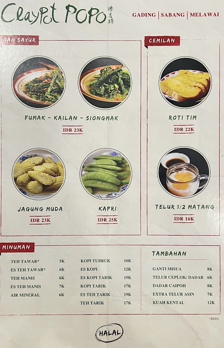 Located in the bustling Blok M area of Jakarta, Claypot Popo Melawai offers a cozy escape for lovers of authentic Chinese-Indonesian comfort food. The menu, while not extensive, showcases delightful claypot dishes that are packed with flavor and warmth. Signature offerings include the Claypot Siram Telor Matang and Claypot Sapi Cah Bawang Putih, both simmered to perfection in rich, aromatic broth.